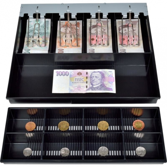 Vyberateľný zásobník na mince a priehradka na bankovky s voľne nastaviteľnými priehradkami