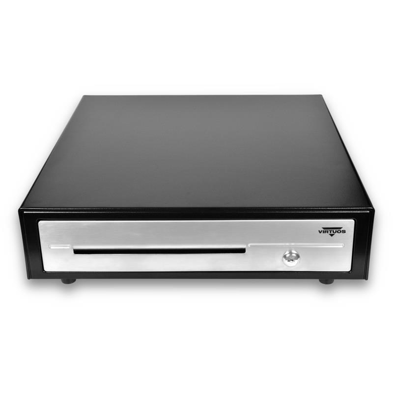 Pokladničná zásuvka Virtuos C430D - s káblom, kovové držiaky, nerezový panel, 9-24V, čierna