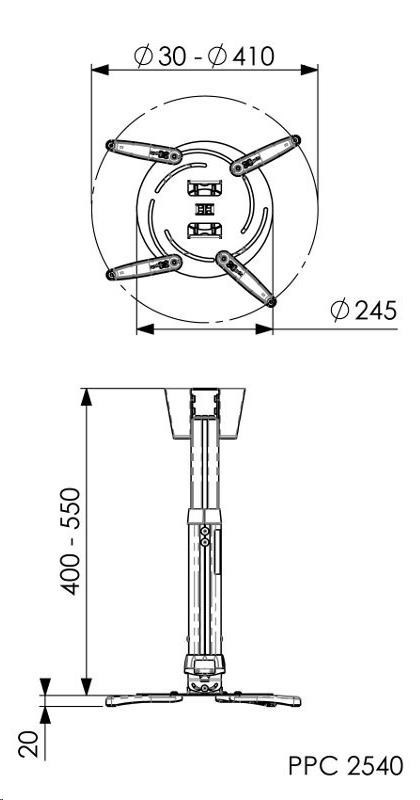 - 4 nastaviteľné montážne ramená s dosahom 30-410 mm