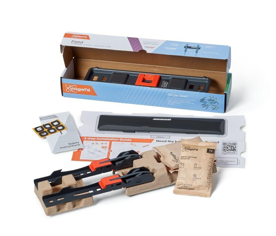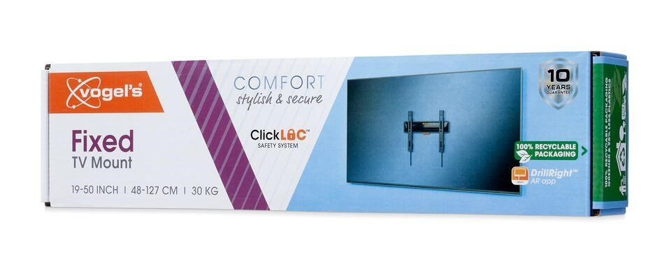 Inštalácia nástenného držiaka COMFORT Fixed je jednoduchá. Všetko je zrozumiteľne vysvetlené v priloženom stručnom návode na inštaláciu. Môžete si tiež online pozrieť podrobný návod alebo inštalačné video. Súčasťou balenia je vrtacia šablóna, skrutky a hmoždinky Fischer® DuoPower a samotný nástenný držiak má zabudovanú vodováhu. Pomocou našej bezplatnej aplikácie DrillRight™ AR App si môžete vďaka rozšírenej realite ľahko prezrieť, ako bude vyzerať váš televízor v konkrétnom interiéri a označiť na stene presnú polohu pre prvý vrtací otvor. Potom priložíte vrtaciu šablónu a označíte si zvyšné otvory pre montáž držiaka.