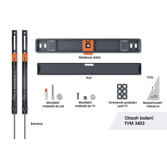 U nástenného držiaku TVM 3403 je bezpečnosť na prvom mieste. Držiak je napríklad vybavený bezpečnostným systémom ClickLoc™. Ten pri montáži uzamkne televízor k držiaku pomocou počuteľného kliknutia. Na ochranu zadnej strany televízora počas montáže je nástenný držiak vybavený mäkkými podložkami. Držiak je testovaný na 3x vyššiu záťaž, než je jeho maximálna nosnosť.