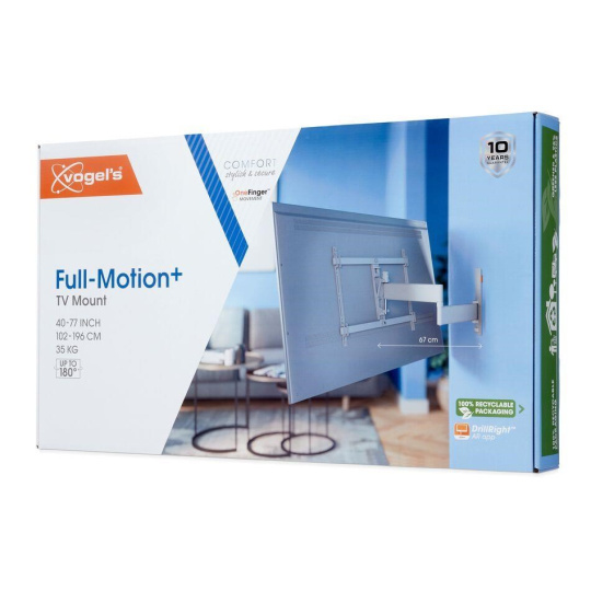 Umiestnenie televízora do požadovaného pozorovacieho uhla je mimoriadne jednoduché. TVM 3643 je vybavený jedinečnou technológiou One-Finger™ Movement spoločnosti Vogel's. Pohyb s držiakom je potom veľmi ľahký a plynulý. Vďaka extrémne dlhým ramenám môžete televízor natočiť do veľkého uhla. Maximálny uhol natočenia potom závisí od šírky konkrétneho televízora.