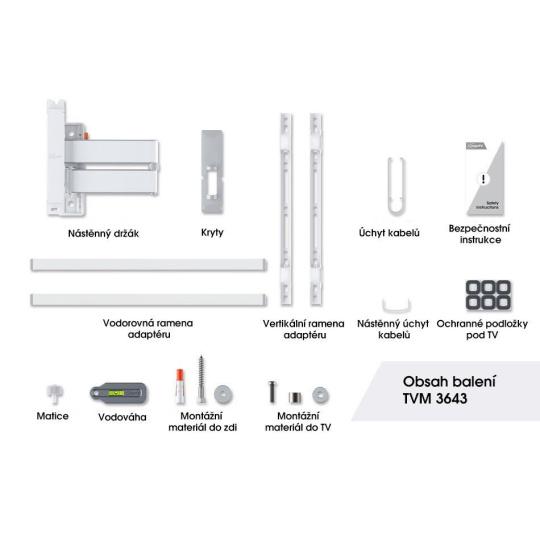 Pre bezpečné naklonenie televízora je nástenný držiak vybavený systémom TiltAnchor™, ktorým môžete zamknúť naklonenie TV. Mäkké podložky na nástennom držiaku chránia zadnú stranu televízora pred poškriabaním počas jeho montáže. TVM 3643 sa ľahko inštaluje. Súčasťou balenia je vrtacia šablóna, skrutky, hmoždinky Fischer® DuoPower, stahovacie pásky na káble a vodováha. Jednoducho si označte prvý vrtací otvor pomocou našej bezplatnej aplikácie DrillRight™ AR. Je váš televízor mierne nakrútený? Žiadny problém. Môžete ho ľahko vyrovnať aj po inštalácii.