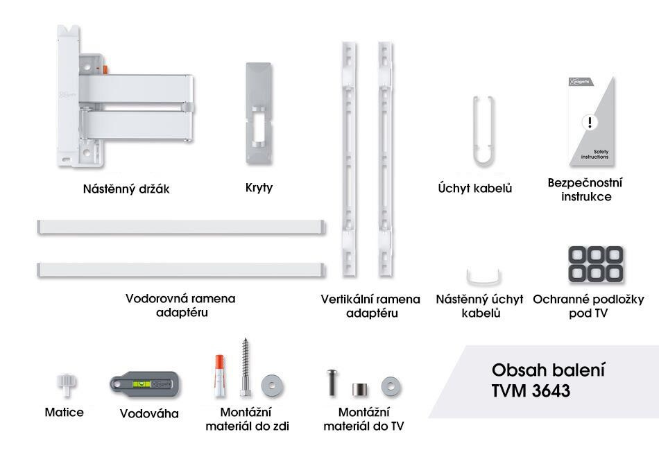 Pre bezpečné naklonenie televízora je nástenný držiak vybavený systémom TiltAnchor™, ktorým môžete zamknúť naklonenie TV. Mäkké podložky na nástennom držiaku chránia zadnú stranu televízora pred poškriabaním počas jeho montáže. TVM 3643 sa ľahko inštaluje. Súčasťou balenia je vrtacia šablóna, skrutky, hmoždinky Fischer® DuoPower, stahovacie pásky na káble a vodováha. Jednoducho si označte prvý vrtací otvor pomocou našej bezplatnej aplikácie DrillRight™ AR. Je váš televízor mierne nakrútený? Žiadny problém. Môžete ho ľahko vyrovnať aj po inštalácii.