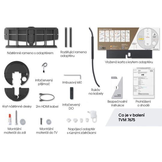 - štíhly 4,5 metrový HDMI kábel (pri použití držiaka MotionMount v kombinácii s TV s externým prijímačom napriklad Samsung s One Connect Box)