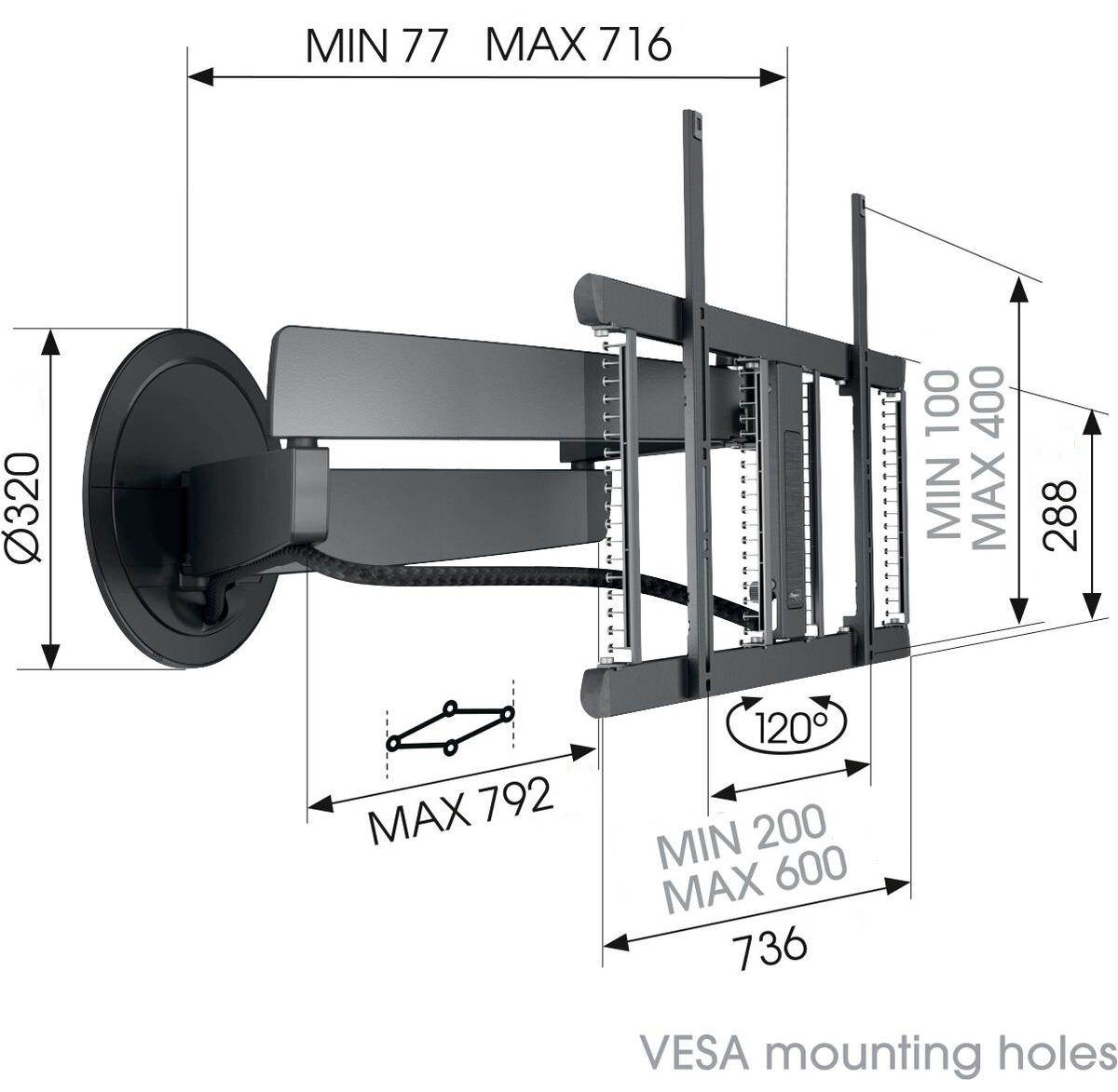 - Vzdialenosť od steny 77 – 716 mm