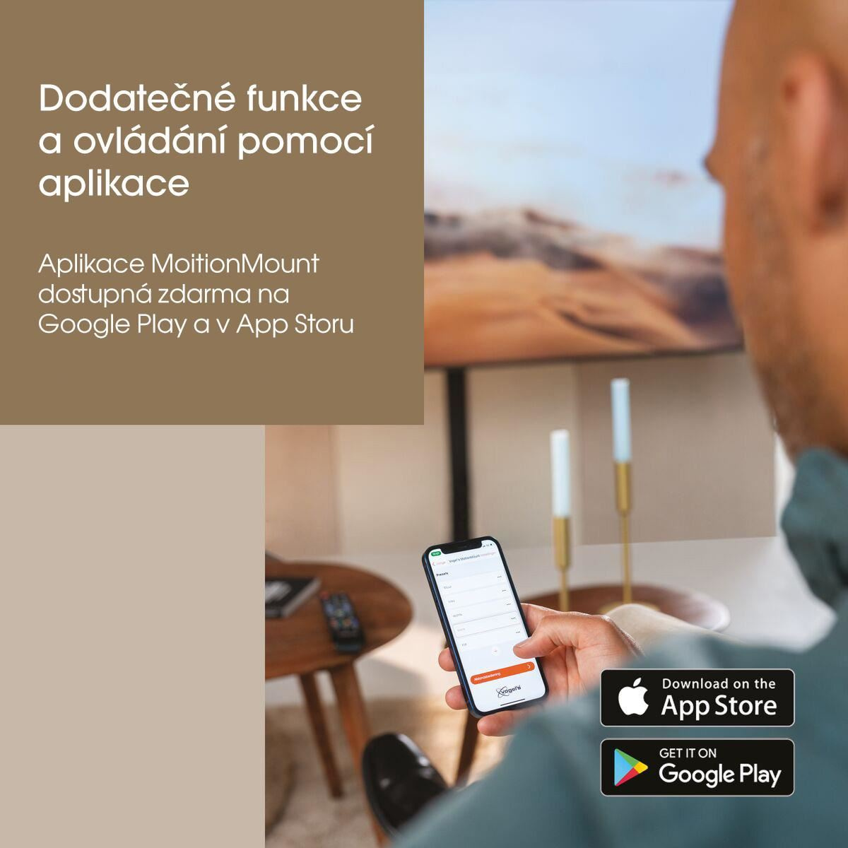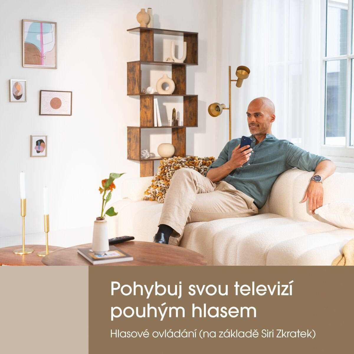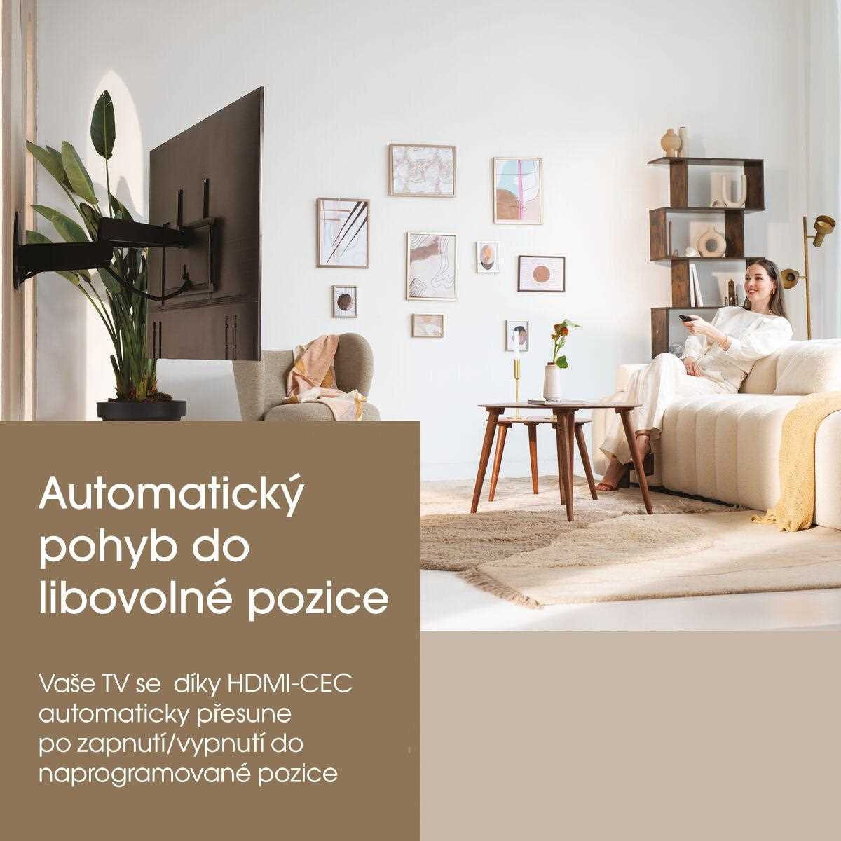 Nemusíte vstávať z pohodlného kresla. Hneď ako zapnete televízor, držiak sa automaticky natočí do predvolenej polohy. Chcete natočiť obrazovku? Pomocou hlasu (hlasové ovládanie Siri, založené na skratkách Siri) presuňte obrazovku do jednej z vašich predvolených pozícií. Alebo jednoducho ovládajte držiak pomocou diaľkového ovládača alebo prostredníctvom bezplatnej aplikácie MotionMount v telefóne či tablete (iOS alebo Android). Celkovo môžete vytvoriť a nastaviť 7 rôznych preferovaných polôh.