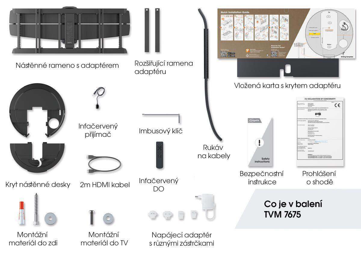 Systém vkladania káblov (CIS®) v nosných ramenách spája, chráni a skrýva káble medzi stenou a televízorom. Okrem toho je TVM 7675 vybavený integrovanými držiakmi káblov. Tieto umožňujú uložiť takmer 4 metre káblov za televízor a udržať ich upratané mimo dohľad za krycou doskou. Máte tiež možnosť skryť káble vo stene tým, že ich pretiahnete šterbinou v nástennej doske držiaku. Súčasťou balenia je HDMI kábel dĺžky 2 metre, ktorý umožňuje automatickú funkciu držiaka MotionMount pri zapínaní a vypínaní televízora. Okrem toho dodávame v balení infračervené diaľkové ovládanie s prijímačom a môžete si stiahnuť bezplatnú aplikáciu MotionMount, ktorá vám umožní ovládať držiak prostredníctvom mobilného zariadenia Apple alebo Android cez Bluetooth.