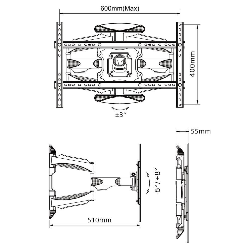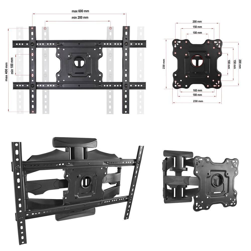 Výsuvný otočný držák na televíziu Ergosolid K600 Kvalitný držák na TV 32-70", výsuvný 58-510mm, otočný +/-75°, sklopný +5°/-8°, korekcia roviny +/-4°, vedenie káblov, VESA štandard 100x100 až 600x400, nosnosť 45,5kg, záruka 5 rokov, balenie obsahuje inštalačný materiál Ponúkame kvalitný držák na televíziu v krásnom dizajne za veľmi priaznivú cenu. Nástenný držák Ergosolid K600 je výsuvný, nastavíte si vzdialenosť od steny podľa vlastnej potreby, televíziu môžete otáčať do strán, naklápať, upraviť rovinu. Je vhodný na zavorenie všetkých typov a značiek televízorov s uhlopriečkou 32-70", ktoré podporujú niektorý VESA od 100x100 až do 600x400 a ktorých hmotnosť nie je vyššia ako 45kg. Konštrukcia držáka je mimoriadne pevná a spoľahlivá, nedochádza k provešeniu a ani pri častom polohovaní nevznikajú na držáku vôľe, nastavenie polohy je pritom vždy pohodlné a jednoduché. Inštalácia držáka na stenu je veľmi jednoduchá, zvládne ju aj laik, inštalačný materiál je súčasťou balenia. Ramena držáka sú osadené dizajnovými krytkami, ktoré sú určené na zafixovanie a skryté vedenie káblov. Farebné prevedenie čierne, záruka 5 rokov. Výsuvný otočný držák na televíziu Ergosolid K600 Technické údaje: nosnosť 45,5kg podpora VESA štandardu 100x100 až 600x400 vhodný na zavorenie všetkých typov a značiek televízorov odporúčaná uhlopriečka televízie 32" až 70" výsuvný - nastavenie vzdialenosti od steny v rozmedzí 58-510mm otočný do strán +/- 75° nastavenie sklonu TV +5° až -8° korekcia roviny obrazovky +/- 4° extrémne pevná a spoľahlivá konštrukcia nevznikajú vôľe ani provešenie pri maximálnom zaťažení dizajnové krytky ramien držáka pre skryté vedenie káblov dizajnové kryty nástenného závesu pohodlné polohovanie televízie jednoduchá inštalácia inštalačný materiál súčasťou balenia farebné prevedenie čierne záruka 5 rokov Držiak s VESA 100x100 až 200x200 a prídavným VESA nástavcom 200x200 až 600x400 na držák TV Ergosolid K600 Výsuvný držák TV Ergosolid K600 podporuje VESA štandardy pre zavorenie TV: VESA 100x100 (bez použitia VESA nástavca) VESA 200x100 a 100x200 (bez použitia VESA nástavca) VESA 200x200 (bez použitia VESA nástavca) VESA 300x200 a 200x300 VESA 300x300 VESA 400x200 a 200x400 VESA 400x300 a 300x400 VESA 400x400 VESA 600x400 Na nástený držák Ergosolid K600 môžete zavrieť všetky typy a značky televízorov, ktorých hmotnosť nepresahuje 45kg a ktoré podporujú niektorý z vyššie uvedených VESA štandardov. Veľkosť televízie nie je podstatná, uvedené uhlopriečky sú iba informatívne.