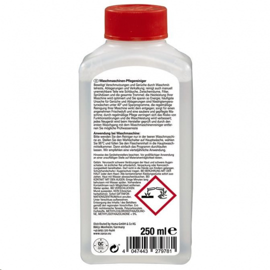 - odstraňuje nečistoty a nepríjemný zápach spôsobený zvyškami vodného kameňa a pracích prostriedkov - nepríjemný zápach a usadeniny vznikajú predovšetkým kvôli nízkej teplote pri pranie (prací programy s teplotou nižšou než 40°C) a úspornému programu; pravidelné čistenie tomu zabraňuje - čistí aj nedostupné časti práčky (výhrevné teleso, hadice, medzery, tesnenia, filtre, trysky a celý prací bubon) - optimalizuje ohrevný výkon a šetrí energiu - pravidelné čistenie znižuje riziko poškodenia práčky a zlepšuje prací výkon - bezpečnostný uzáver - objem: 250 ml Informácie pre spotrebiteľa: Použitie Prostriedok používajte iba v prázdnej práčke bez prádla, pracích prostriedkov. Obsah fľaše nalejte do zásobníka na prací prostriedok pre hlavné pranie. Spustite hlavný program pri teplote 95° a počkajte, kým práčka nedokončí celý program