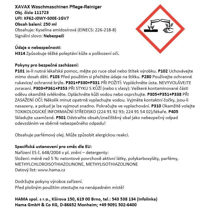 - odstraňuje nečistoty a nepríjemný zápach spôsobený zvyškami vodného kameňa a pracích prostriedkov - nepríjemný zápach a usadeniny vznikajú predovšetkým kvôli nízkej teplote pri pranie (prací programy s teplotou nižšou než 40°C) a úspornému programu; pravidelné čistenie tomu zabraňuje - čistí aj nedostupné časti práčky (výhrevné teleso, hadice, medzery, tesnenia, filtre, trysky a celý prací bubon) - optimalizuje ohrevný výkon a šetrí energiu - pravidelné čistenie znižuje riziko poškodenia práčky a zlepšuje prací výkon - bezpečnostný uzáver - objem: 250 ml Informácie pre spotrebiteľa: Použitie Prostriedok používajte iba v prázdnej práčke bez prádla, pracích prostriedkov. Obsah fľaše nalejte do zásobníka na prací prostriedok pre hlavné pranie. Spustite hlavný program pri teplote 95° a počkajte, kým práčka nedokončí celý program