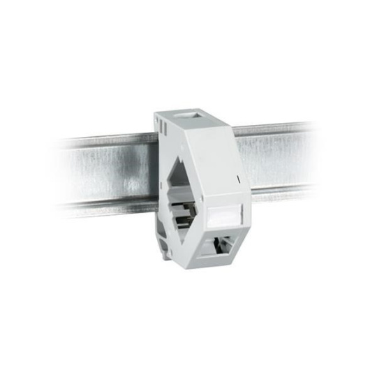 Plastový držiak na 1 lichobežníkový kameň na DIN lištu. Integrovaný kovový pásik zaisťuje uzemnenie lichobežníkového modulu.Štítok pre popis (odnímateľný po odstránení bočného krytu)..