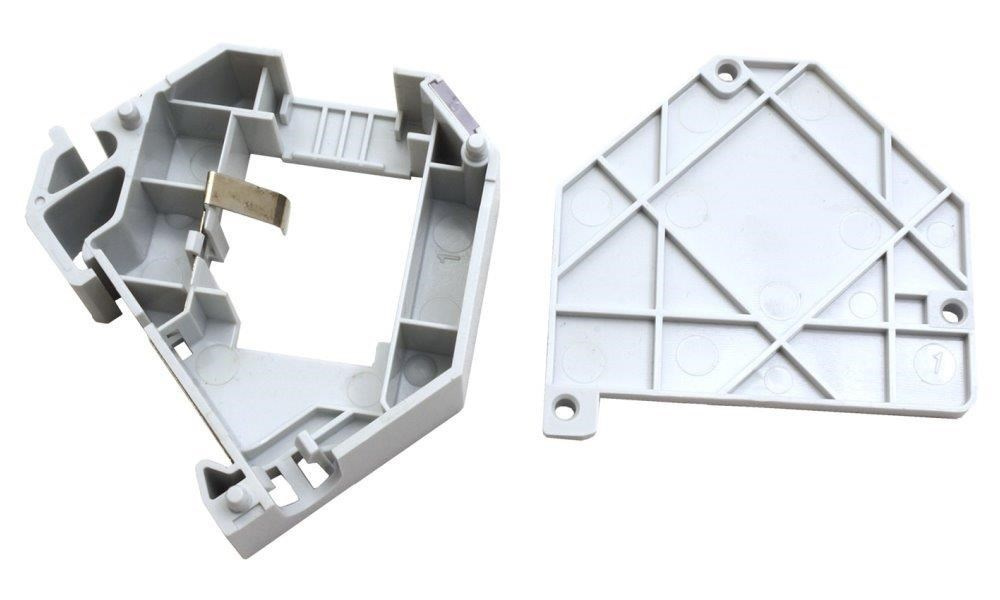 Plastový držiak na 1 lichobežníkový kameň na DIN lištu. Integrovaný kovový pásik zaisťuje uzemnenie lichobežníkového modulu.Štítok pre popis (odnímateľný po odstránení bočného krytu)..