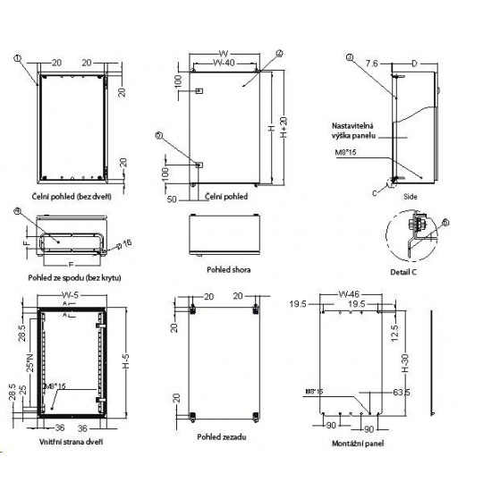 Rozvadeč je vyrobený z valcovanej ocele o hrúbke 1,5 mm. Štandardy: IEC60529, EN60529/10.91, GB4208-93 Vyhotovenie: dvere - plné, otvárateľné o 110 stupňov, montáž pravá alebo ľavá (používateľsky výmenné otváranie) základná krytina - plná bočný kryt - plný horný kryt - plný montážna doska: