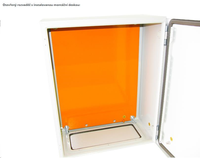 Rozvadeč je vyrobený z valcovanej ocele o hrúbke 1,5 mm. Štandardy: IEC60529, EN60529/10.91, GB4208-93 Vyhotovenie: dvere - plné, otvárateľné o 110 stupňov, montáž pravá alebo ľavá (používateľsky výmenné otváranie) základná krytina - plná bočný kryt - plný horný kryt - plný montážna doska: